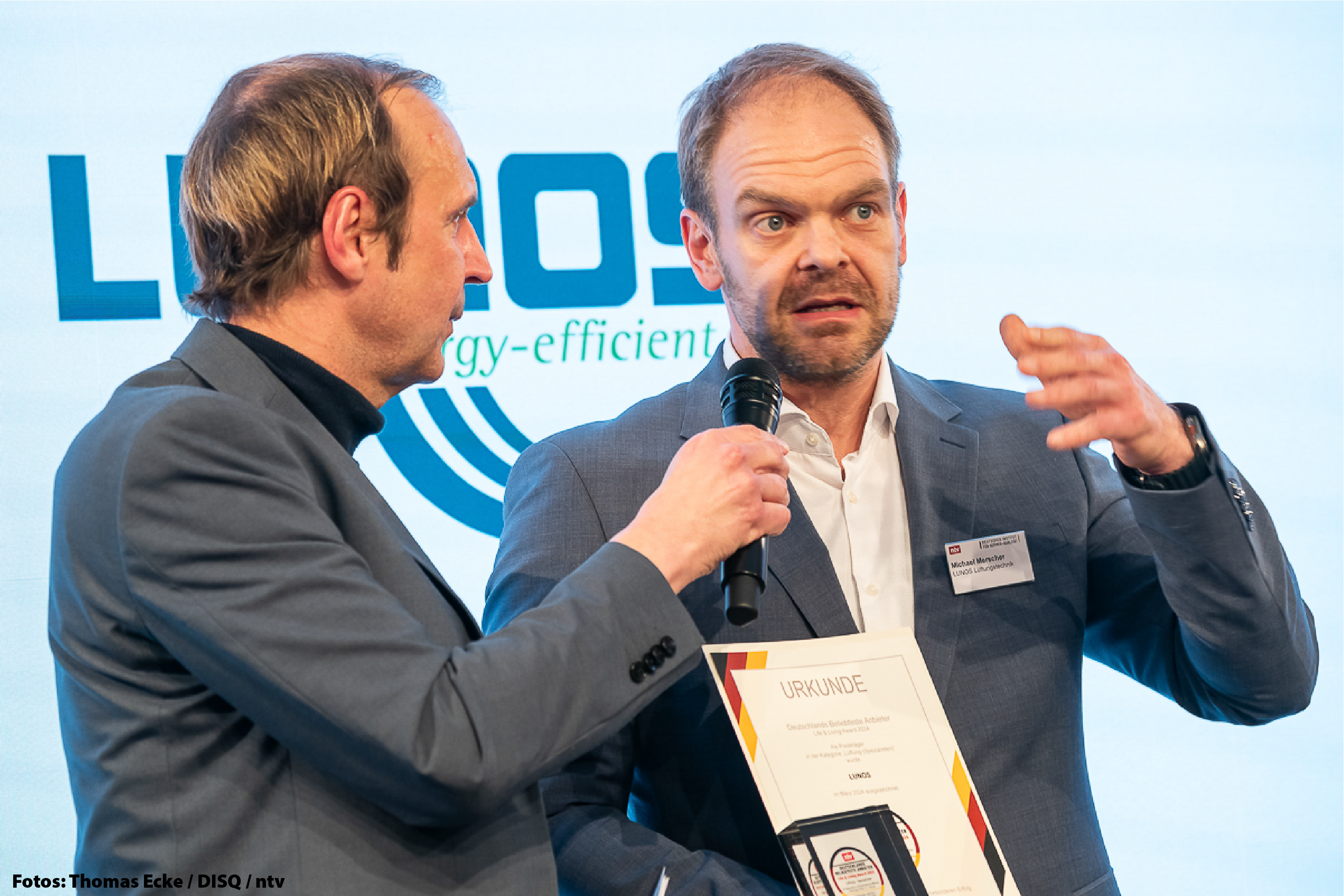 On Thursday, March 14, 2024, the German Institute for Service Quality (DISQ) and the news channel ntv presented Germany's most popular providers with the Live & Living Awards 2024 at the Bertelsmann Representative Office in Berlin. We are delighted to have received an award in the "Ventilation (specialists)" category. Michael Merscher - Member of the Management Board and Technical Director - was delighted to accept the award on our behalf. We would like to thank the consumers of our products and services for their vote.